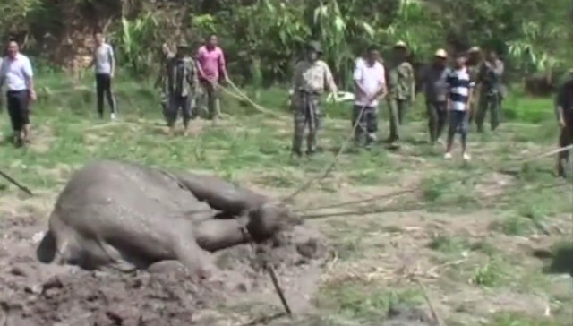 Не е ясно колко дълго е бил в капан този женски слон, но по време за спасяването са видели, че е напълно потопен в калта. Изтощеното животното не е могло да излезе само от ямата. Полицията с помощта на местните жители използвали дъски и въжета, за да я извадят. Спасителната операция продължила три източнителни часа , но си струвало усилията.
