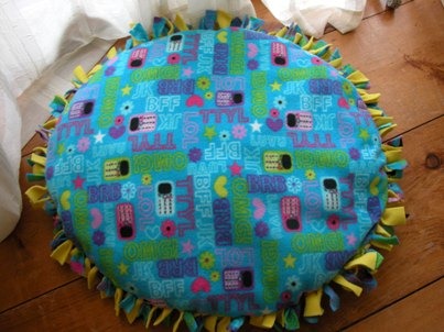 Много лесно,след като сте изрязали хартиен кръг,захването го с карфици за парче от одеялото,и започнете да режете по него.Направете така с още едно парче от одеялото за да получите втори кръг.
