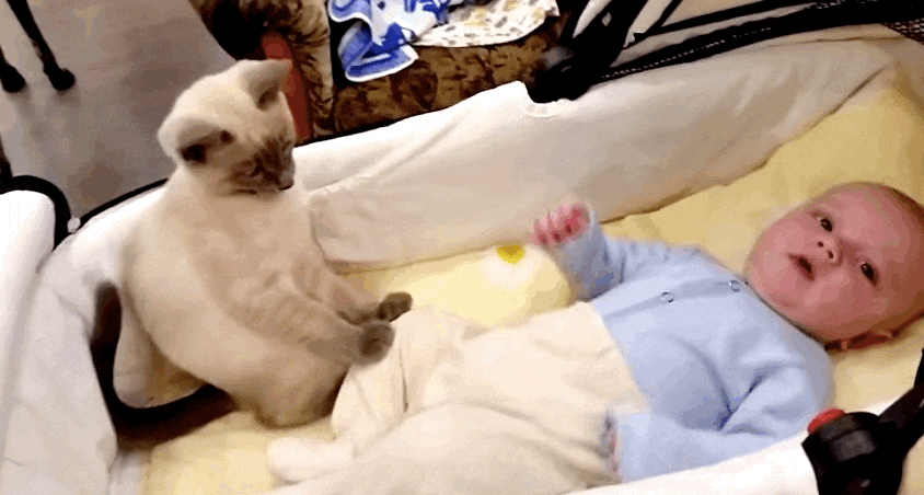 Това малко сиамче върши чудесна работа: грижи се за човешко бебе, въпреки че изглежда малко озадачено и се пита: "Защо това създанието се движи толкова много?"